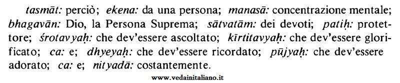 Abbiamo gia’ abbondantemente trattato quest’argomento fin dall’inizio di quest’opera con il verso “janmady asya”. La nostra tendenza naturale di glorificare e ascoltare di altri deve dunque essere diretta sull’unico oggetto di vera glorificazione: l’Essere Supremo. Troveremo cosi’ la felicita’.
